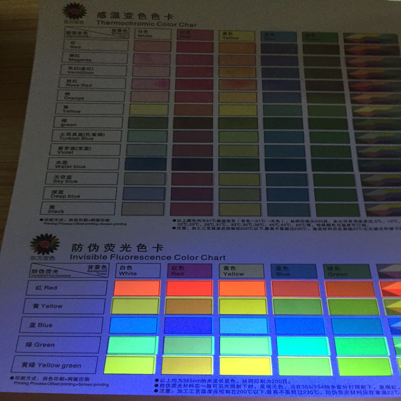防伪荧光油墨是以稀土为主原料而制成的,有机和无机荧光油墨,主要用于防伪产品跟隐形画等产品上。在波长365/254nm的紫外光激发下,能发出耀眼的荧光。颜色可调配,有机荧光基本颜6色:红、黄、黄绿、绿、蓝、草绿。无机基本颜色7种:红、黄、篮、绿、紫、白、桃红
